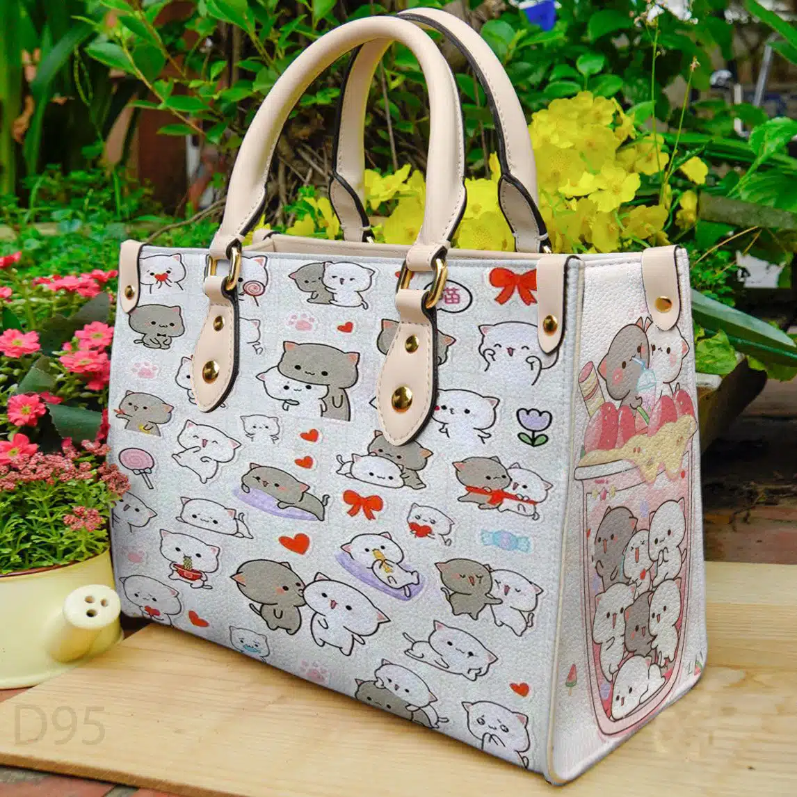Embossed grained leather; Grained leather trim; Microfiber lining; Double-sided printing; Gold-color hardware; Handle: Double; Care Instructions; Maximum washing temperature: 140°F; No bleach; Hang dry in a shady place; Do not reverse to dry