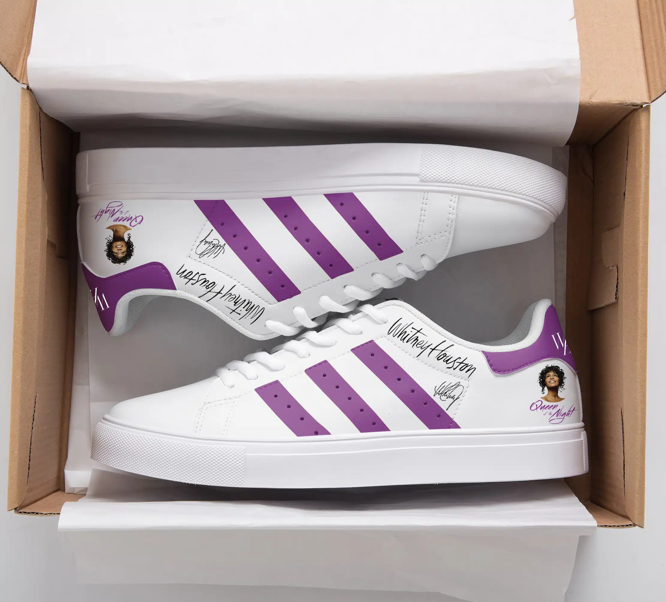 Embroidered contrast leather heel patch with embossed Trefoil logo.
